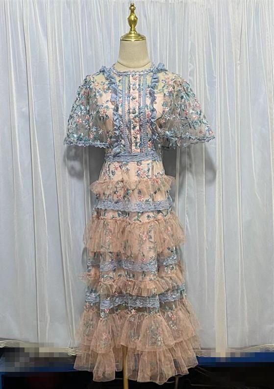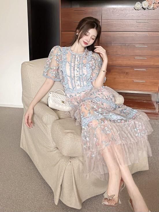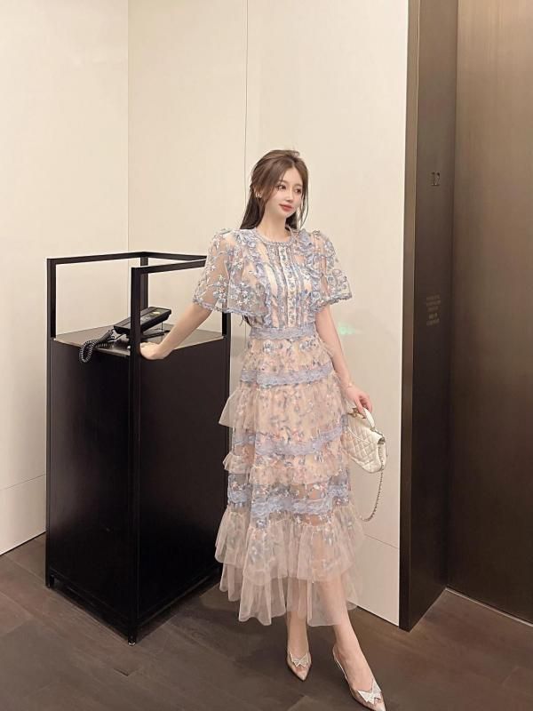 ガーリーなフラワー刺繍 ロング丈ティアードワンピース オケージョンドレス