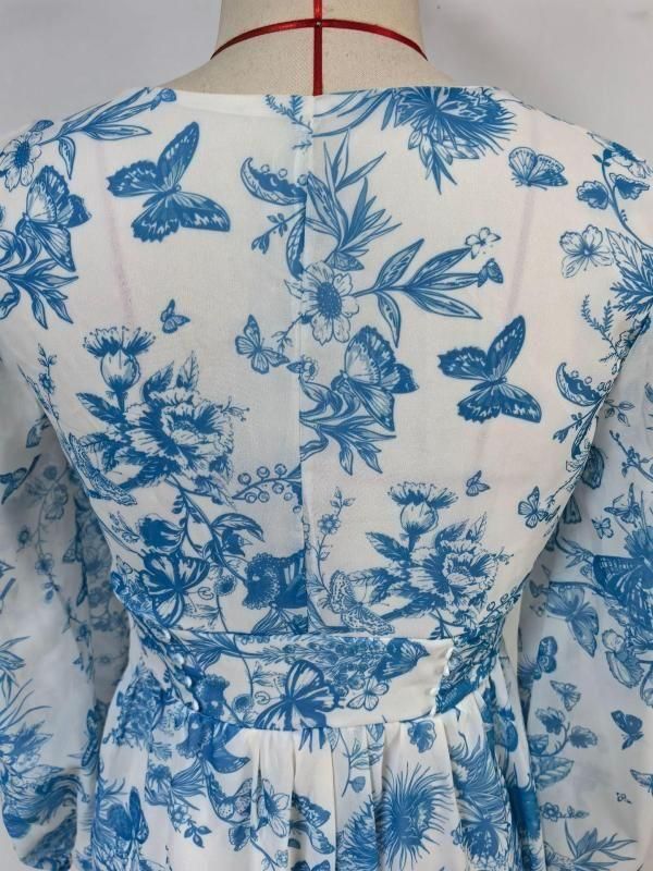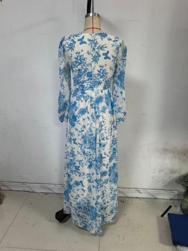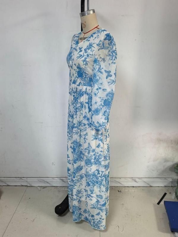 エレガントなフラワープリントが印象的なロング丈長袖ワンピース。