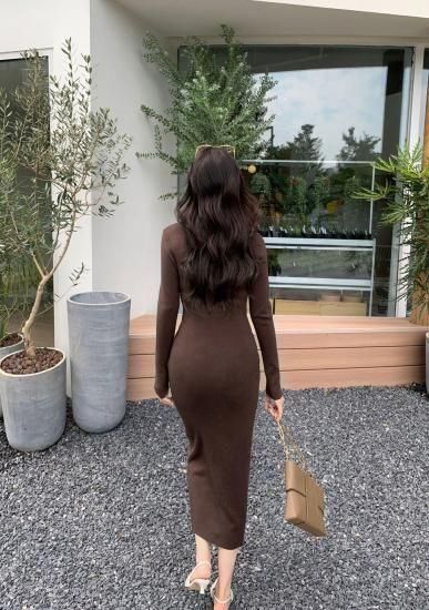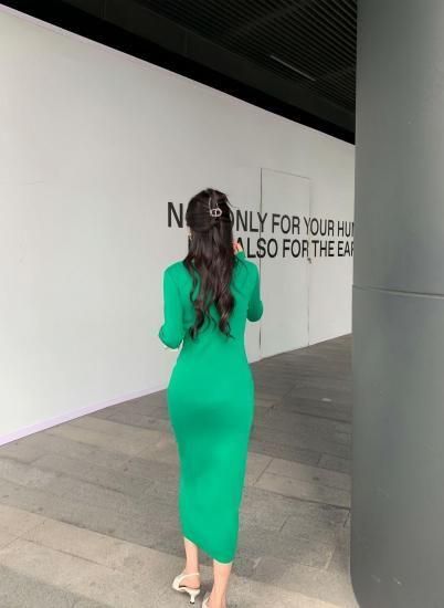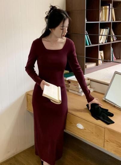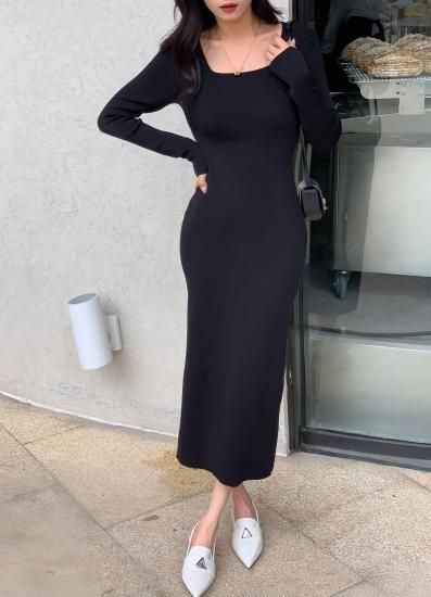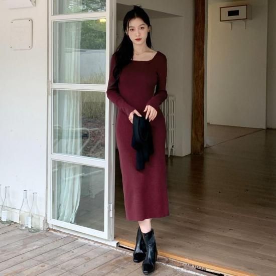 きれいめなスリムシルエットのロング丈長袖ワンピース。