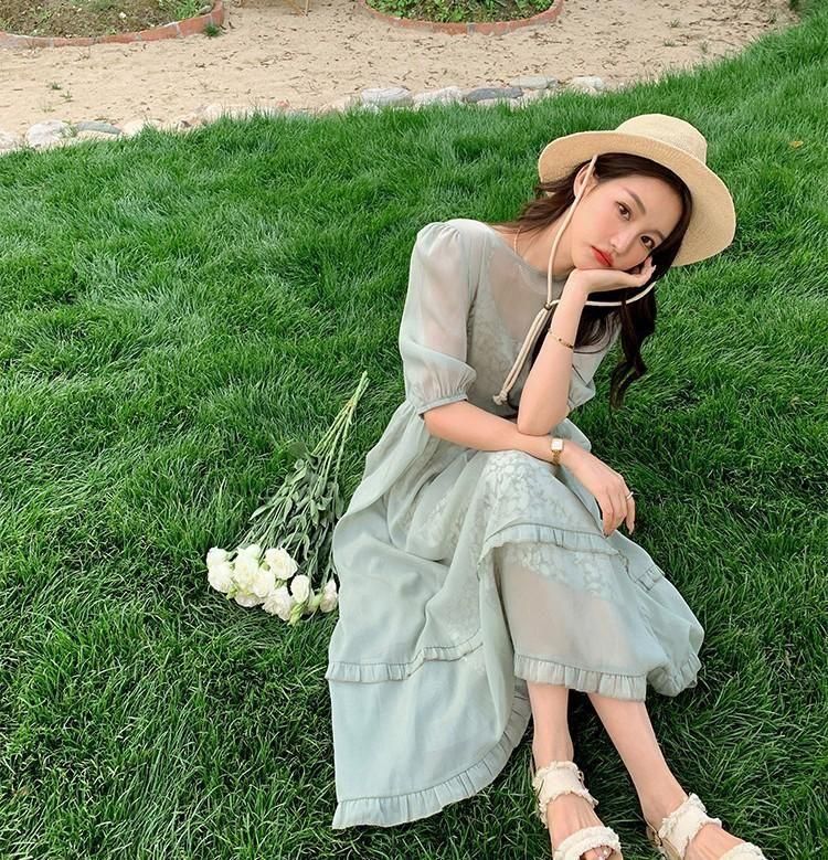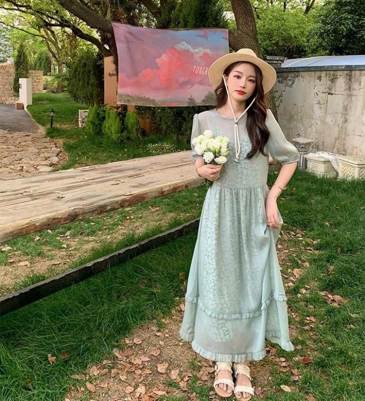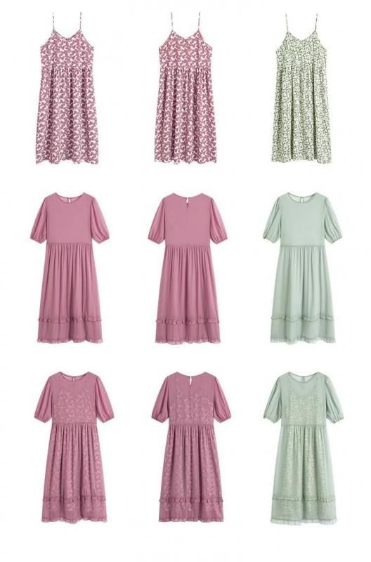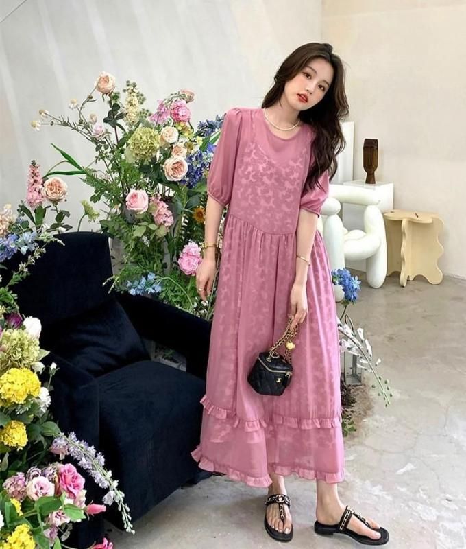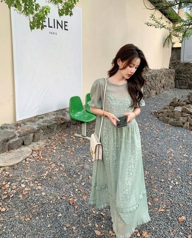 2点セット 清楚ガーリーなロング丈ゆったりシアーワンピース 2色