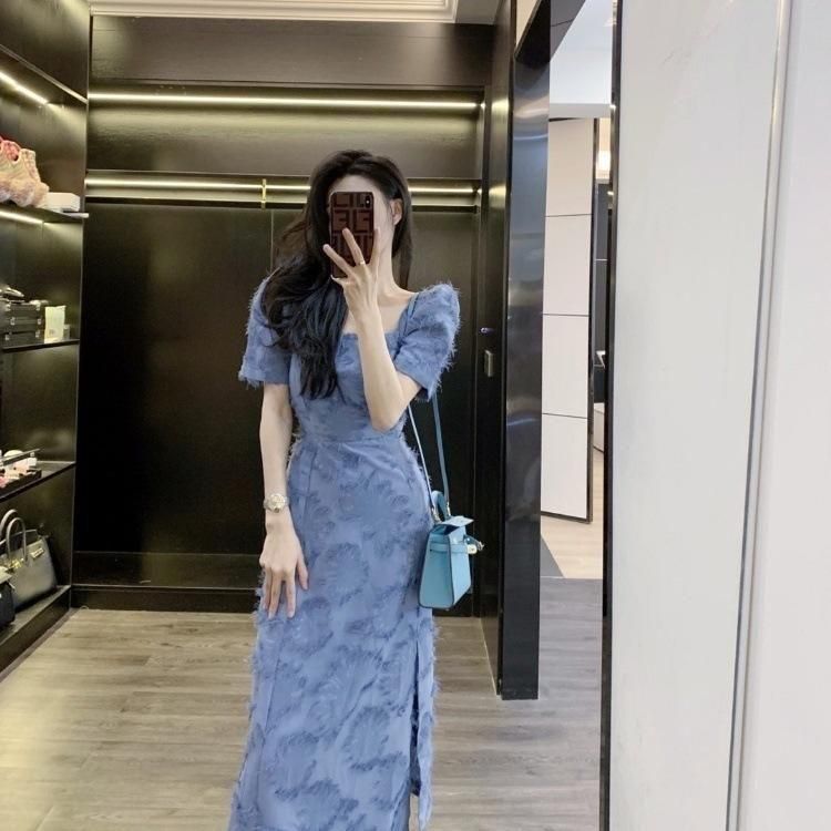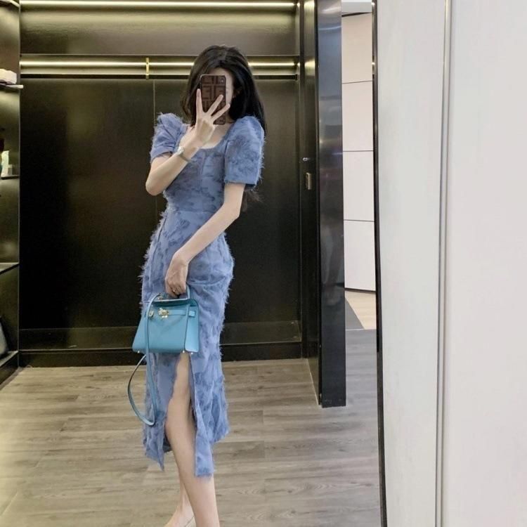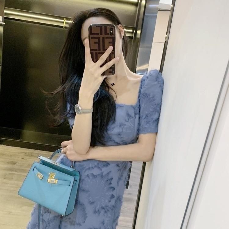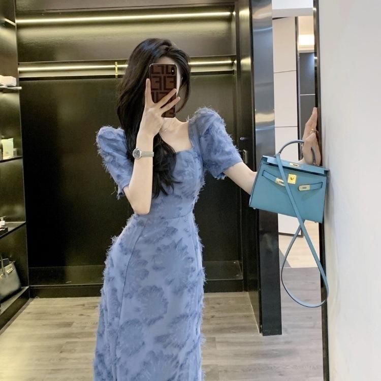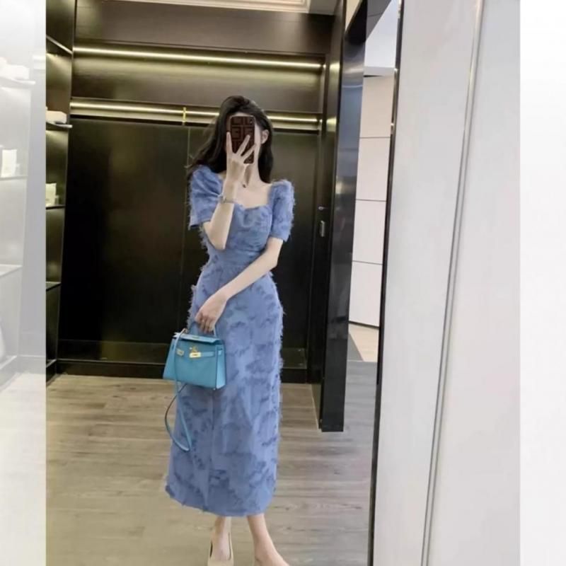 スクエアネックの半袖きれいめワンピース オケージョンドレス 青