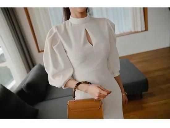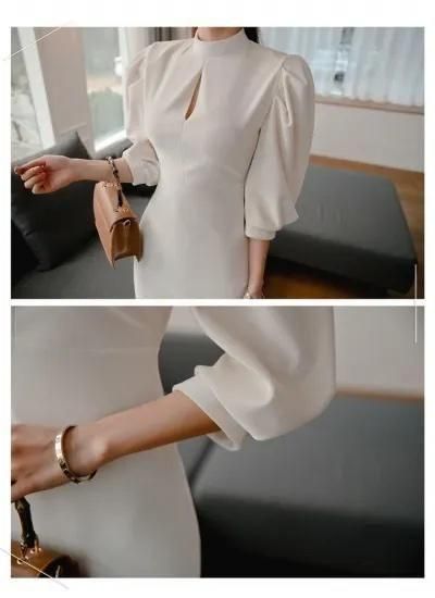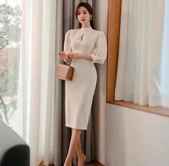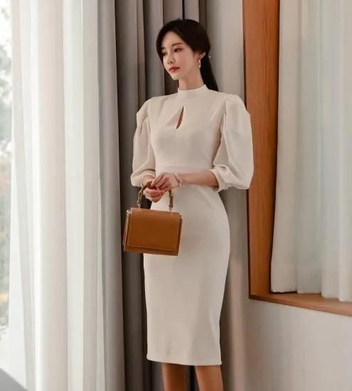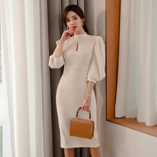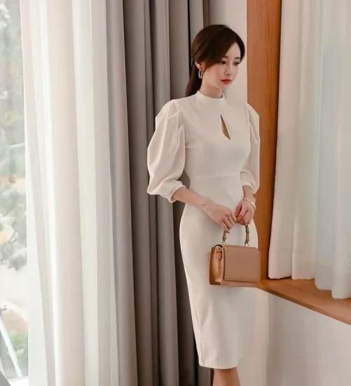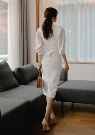 【即納】二次会やお呼ばれに 長袖パフスリーブ上品 きれいめミディ丈タイトワンピース 白