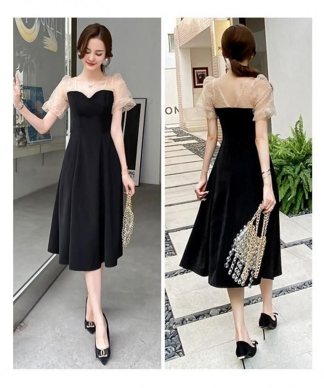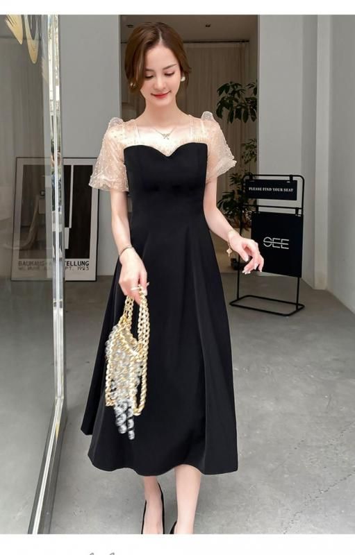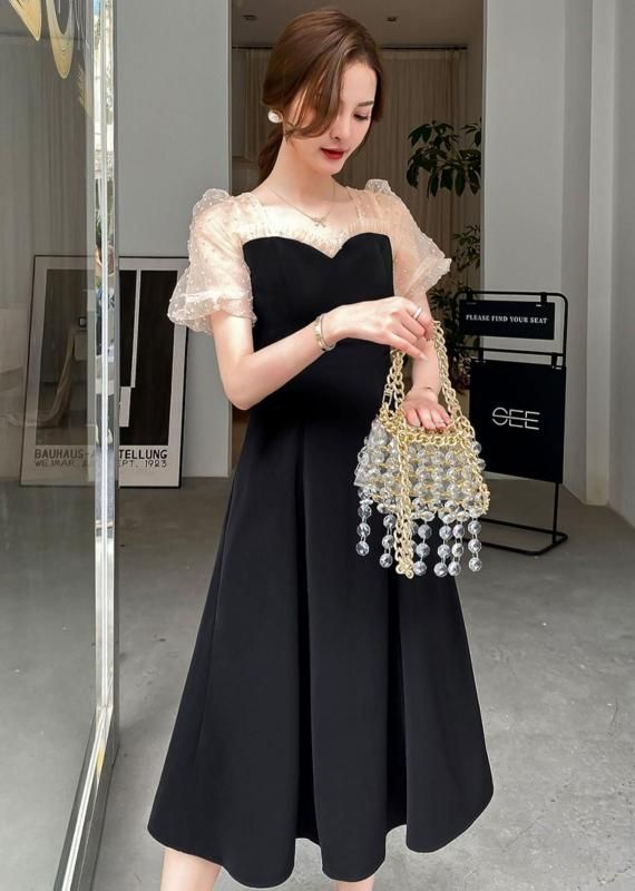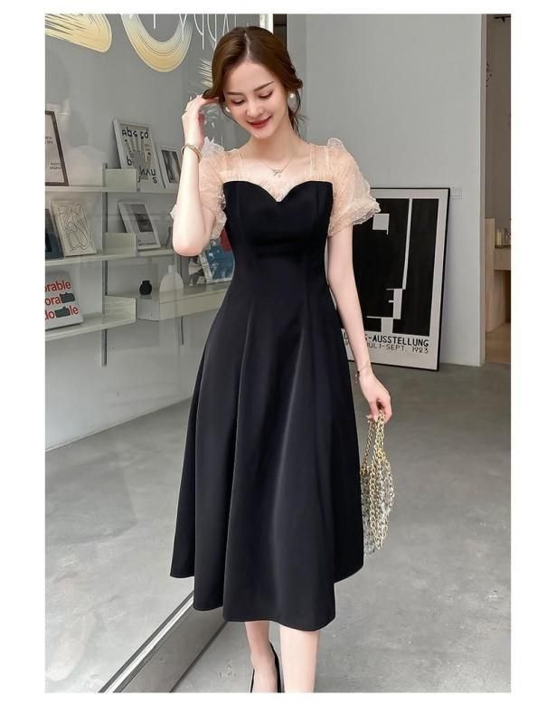 上品かわいい異素材ミックスのブラックオケージョンドレス 黒 XS〜3L