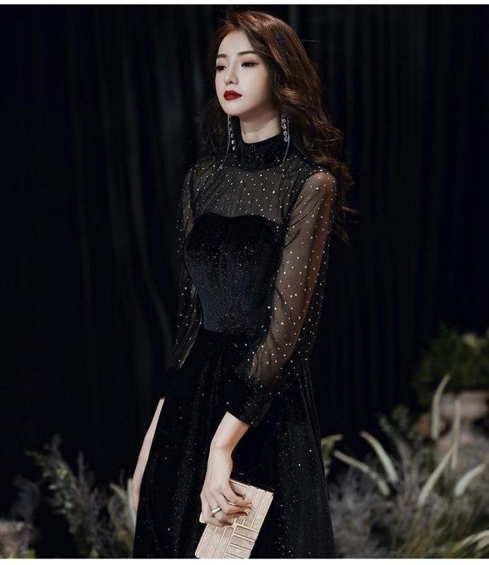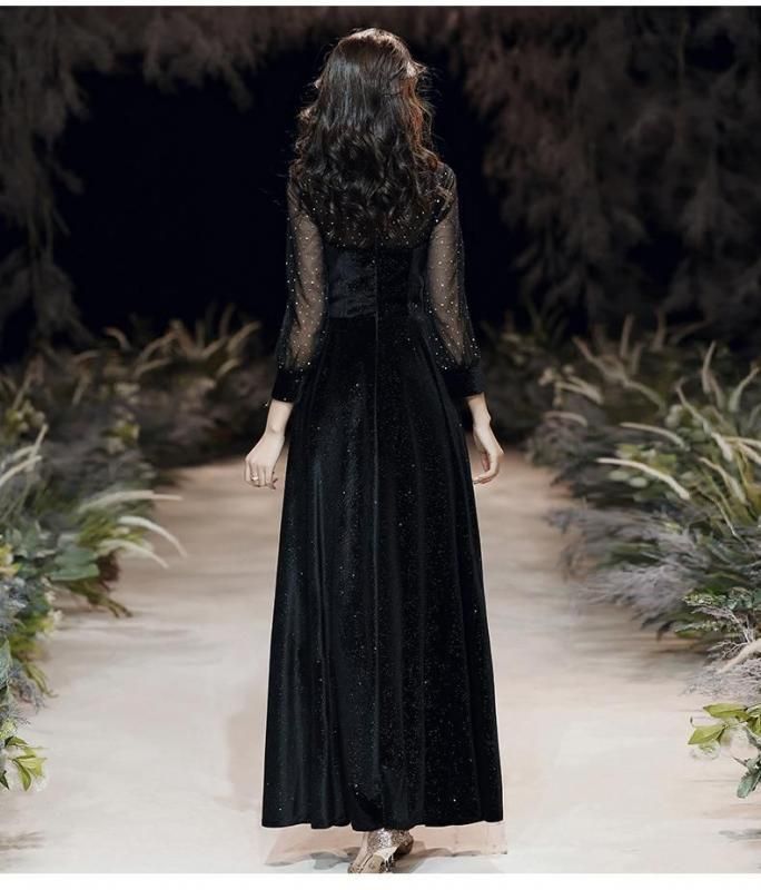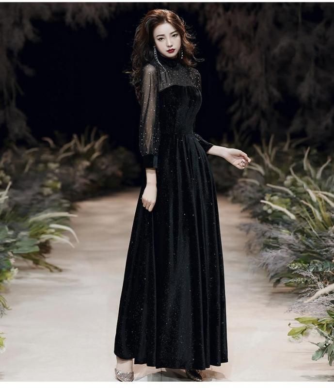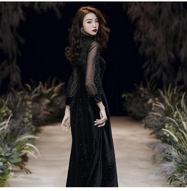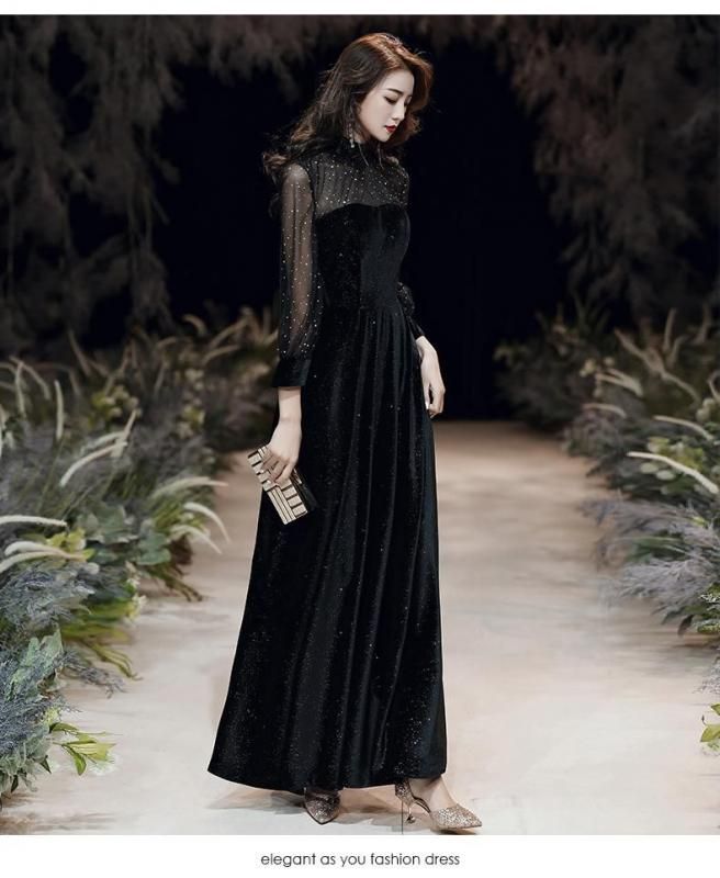 ビジューが華やか スタンドカラーのマキシ丈長袖ブラックドレス オケージョン 黒