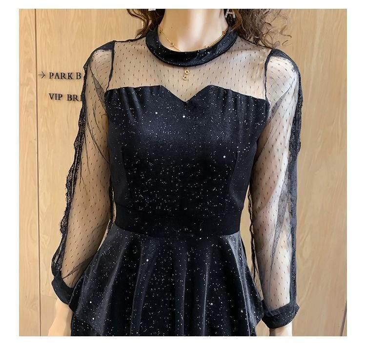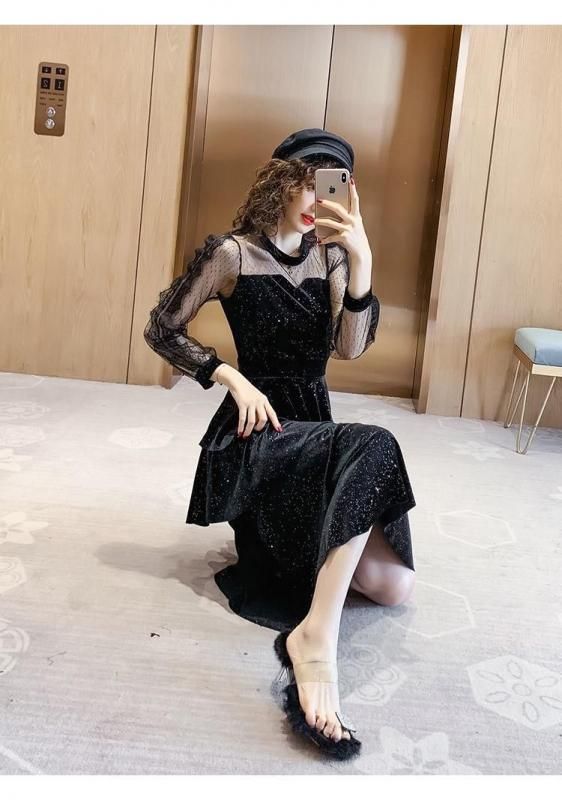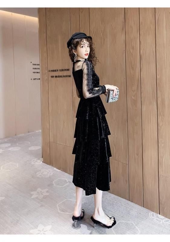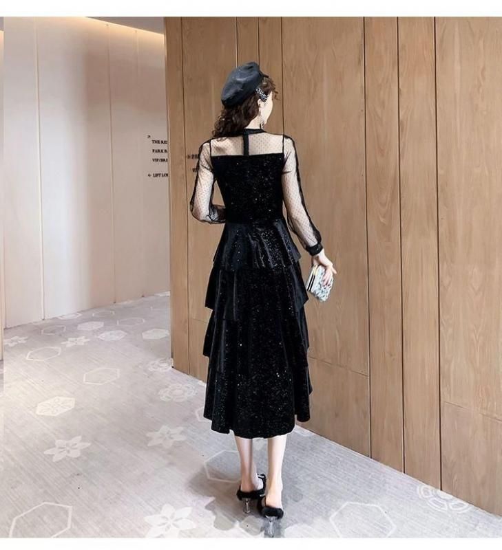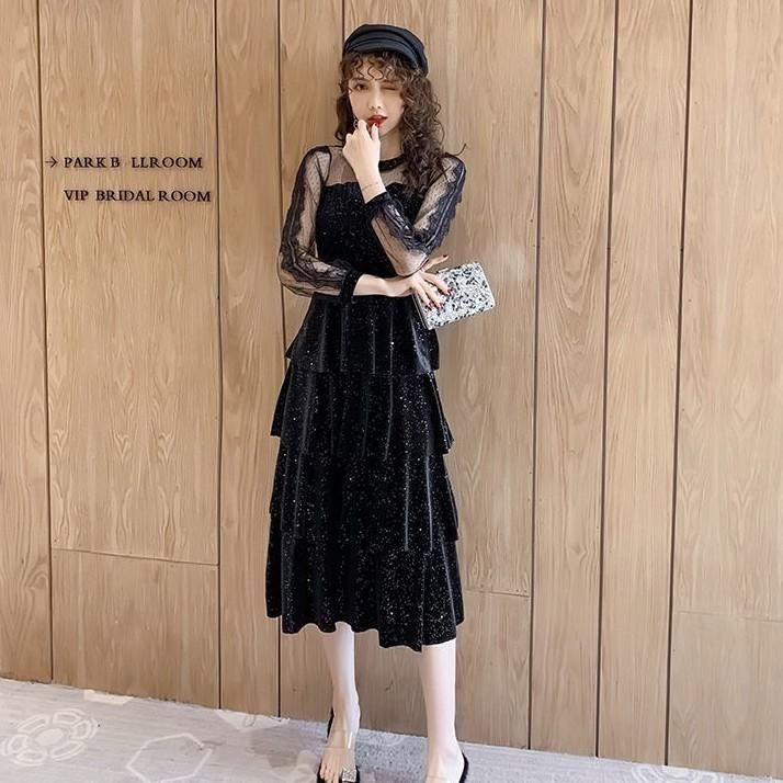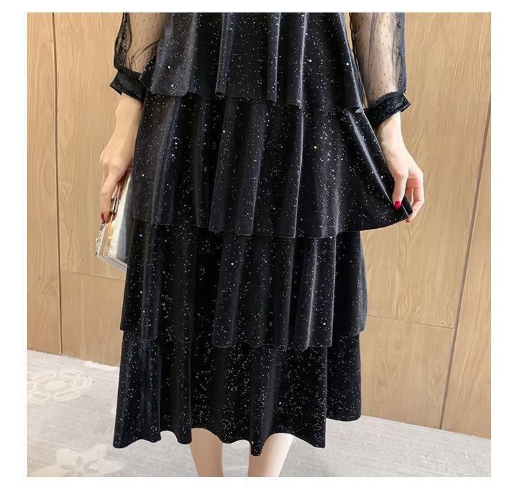ラメ入りティアードスカート シアーミックスのロング丈長袖ブラックドレス S〜5L