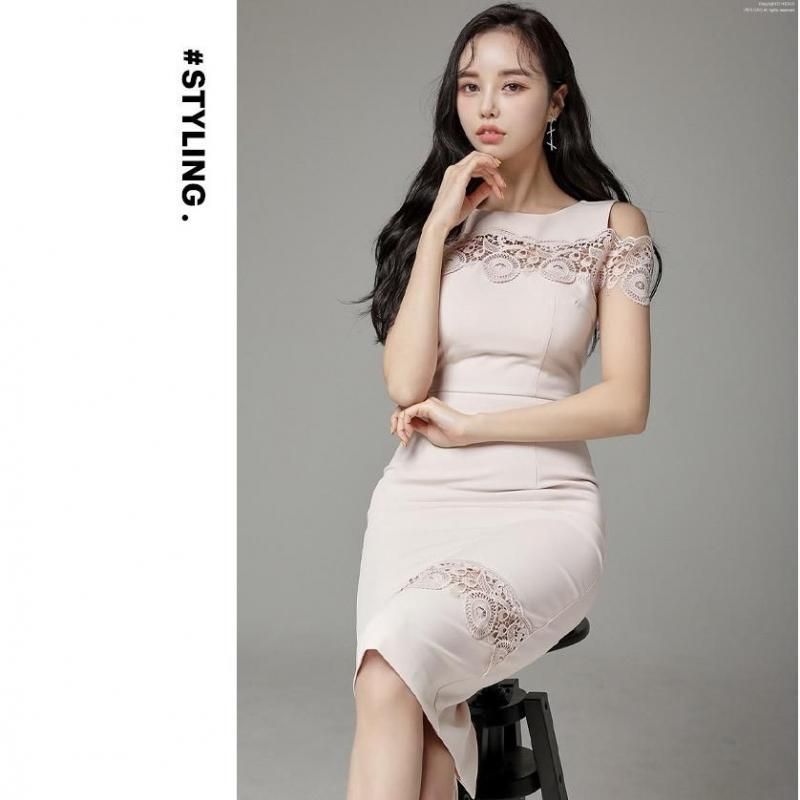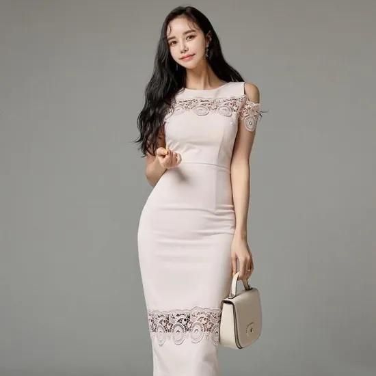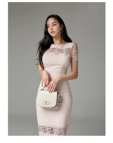 【即納】肩あきレース付きタイトワンピース 上品膝丈ドレス 結婚式やお呼ばれに