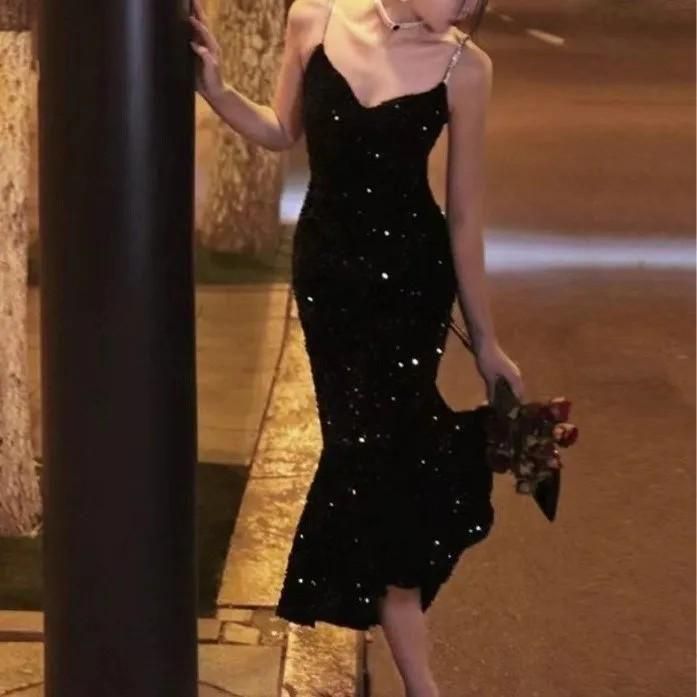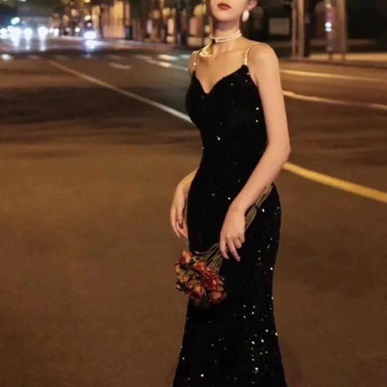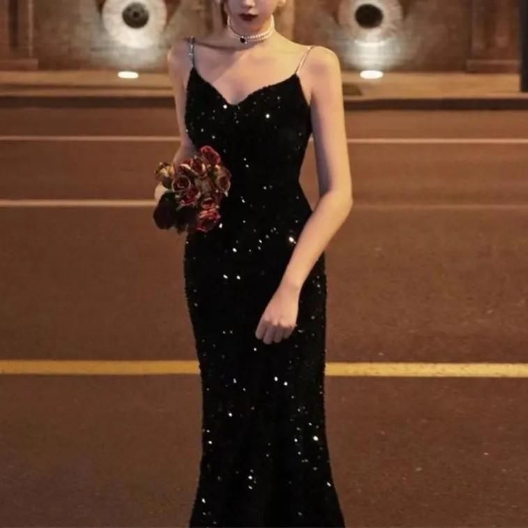 【即納】演奏会や発表会にも ゴージャスなブラックロングドレス キャミソールワンピース 黒/Mサイズ