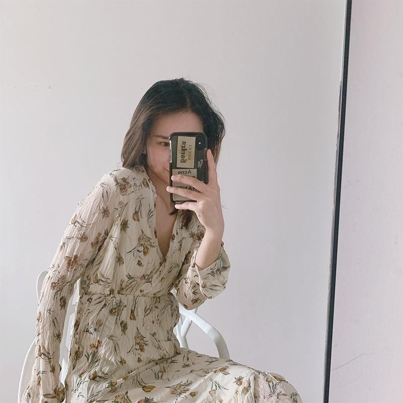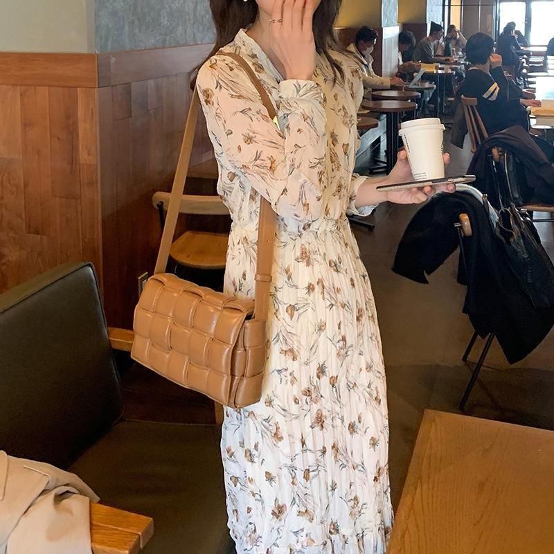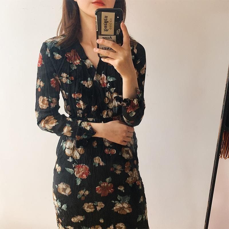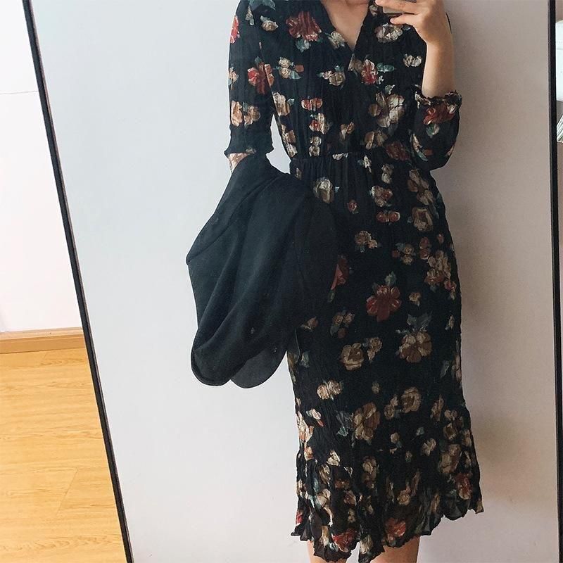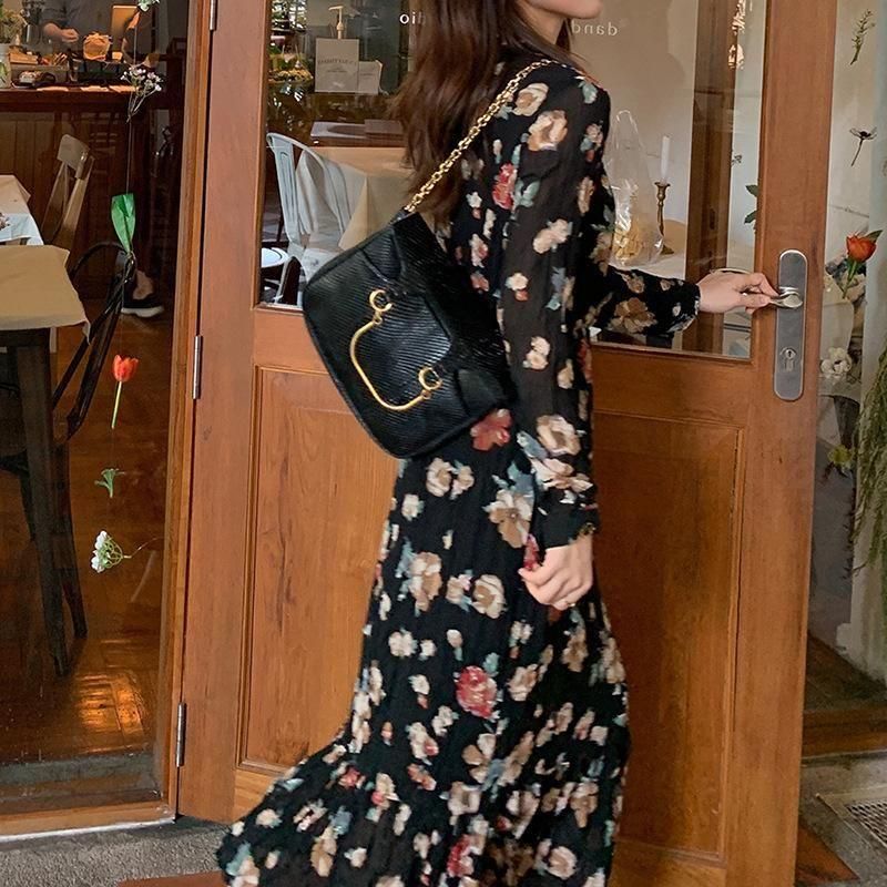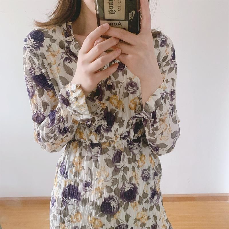 レトロかわいいフラワープリント ロング丈長袖シャーリングワンピース 3色