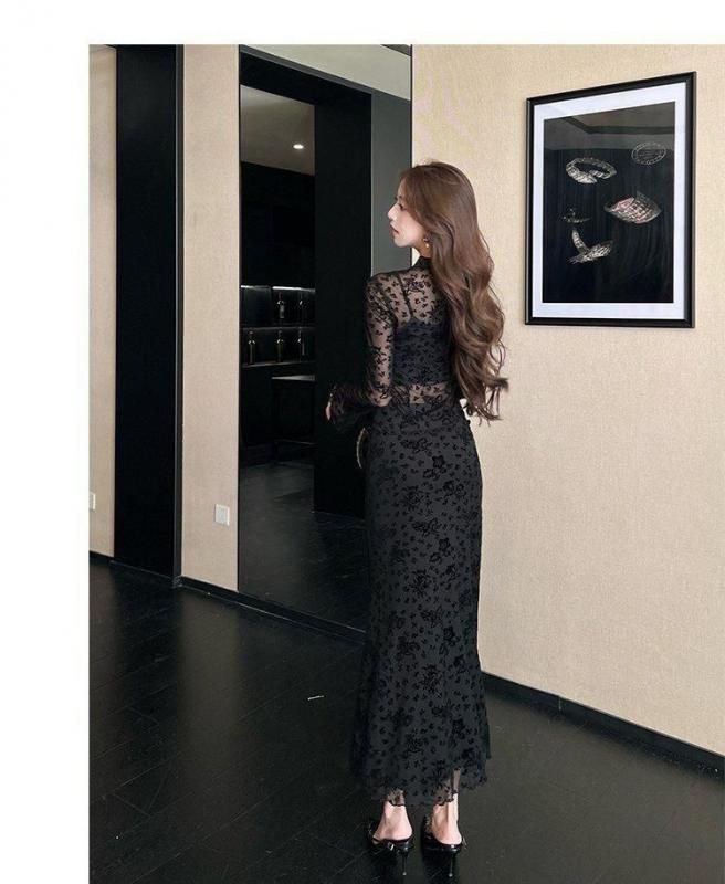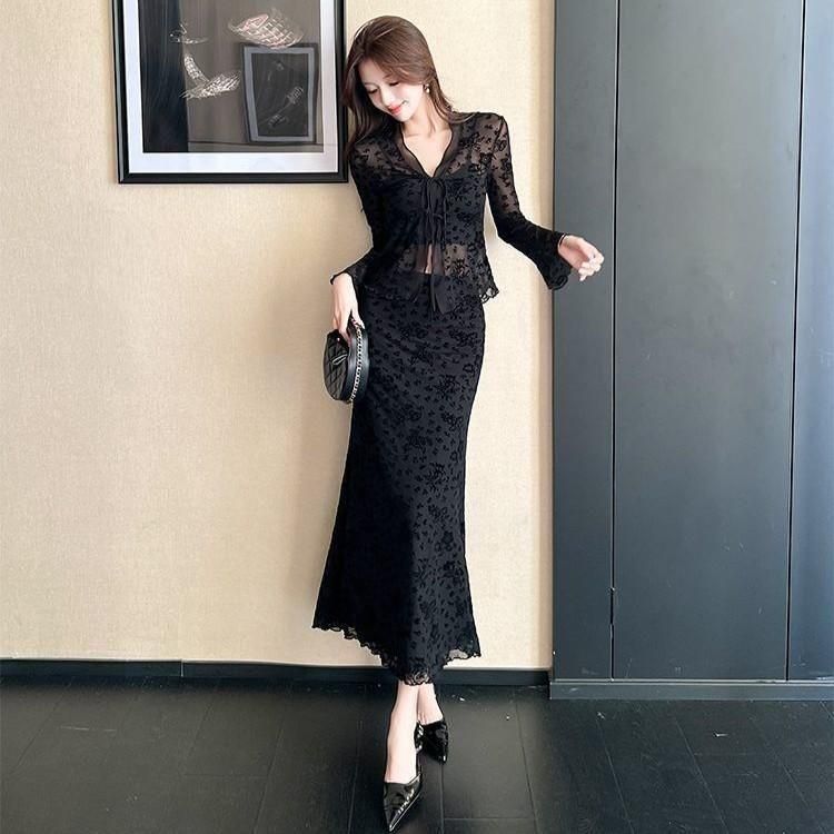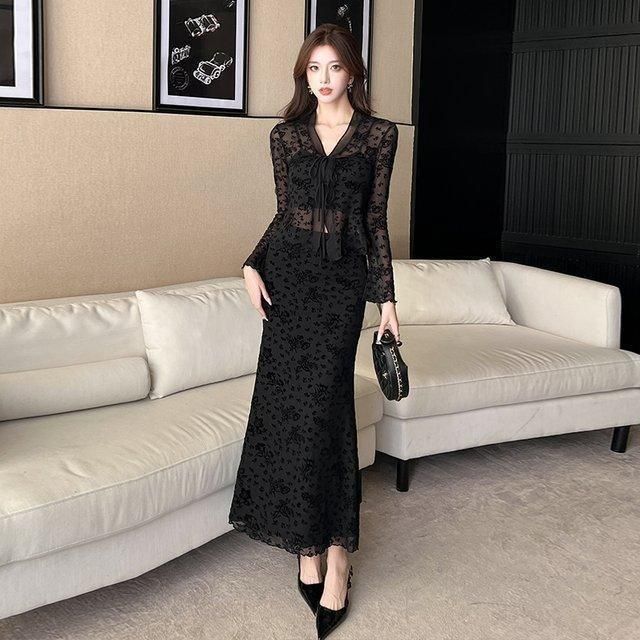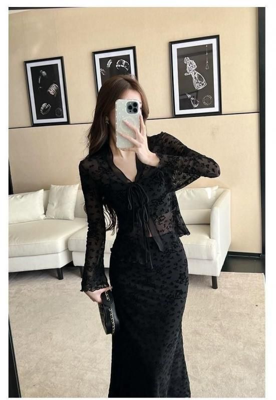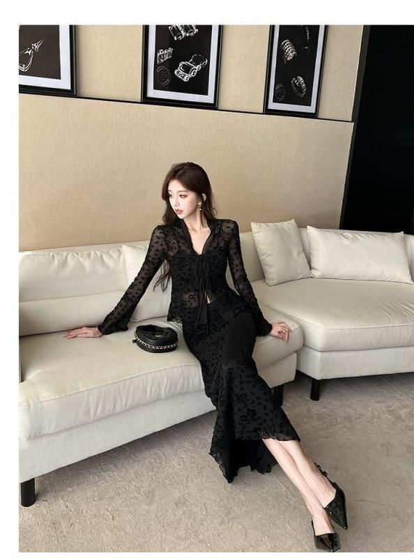 シアーがフェミニンなロングスカートと長袖トップスの総柄ブラックドレス セットアップ 黒