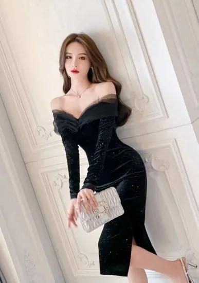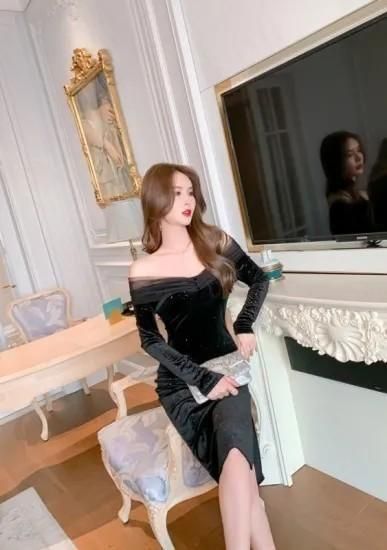 【即納】イブニングドレスにもおすすめ オフショルダーの膝丈長袖タイト黒ワンピース カジュアルドレス/Sサイズ